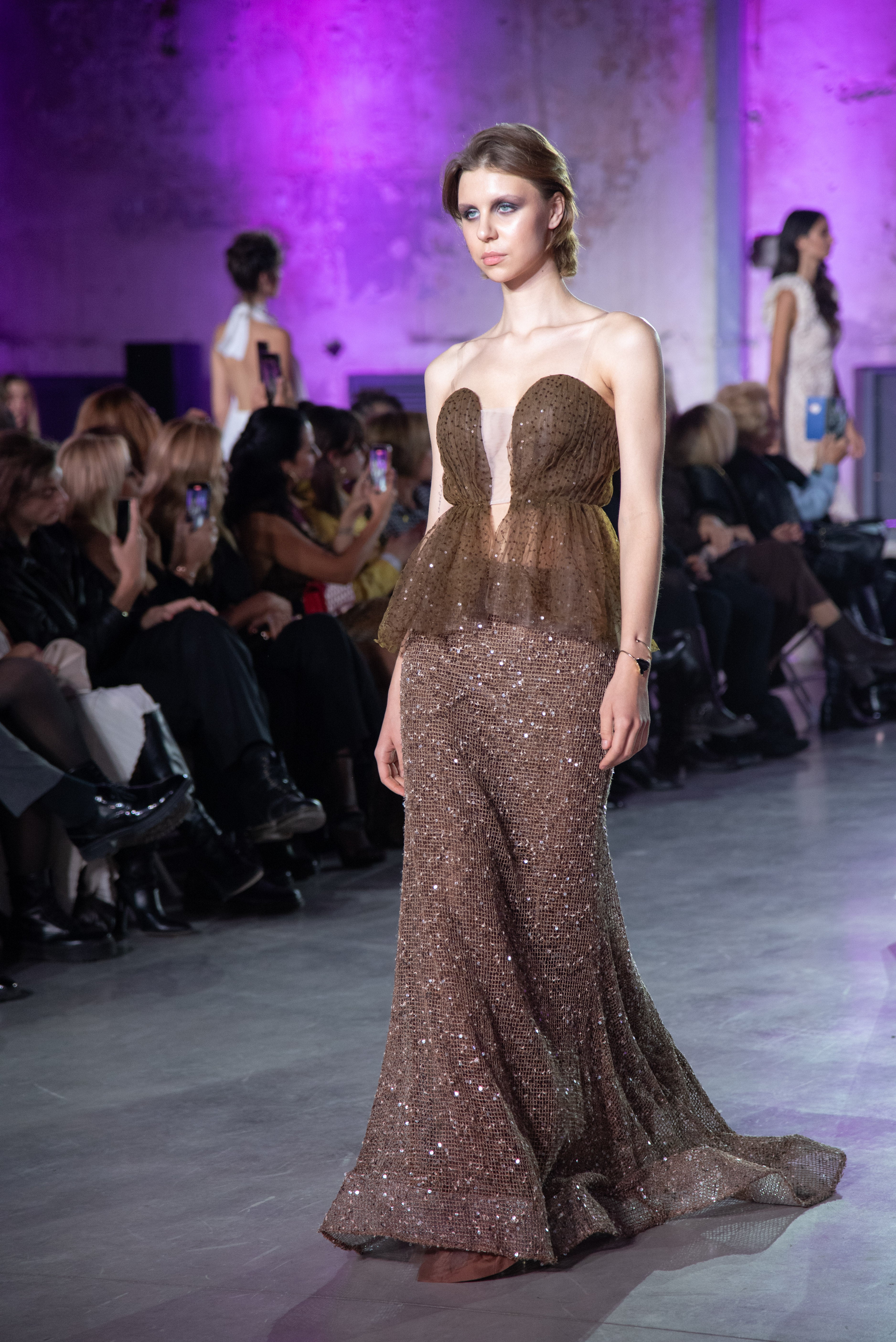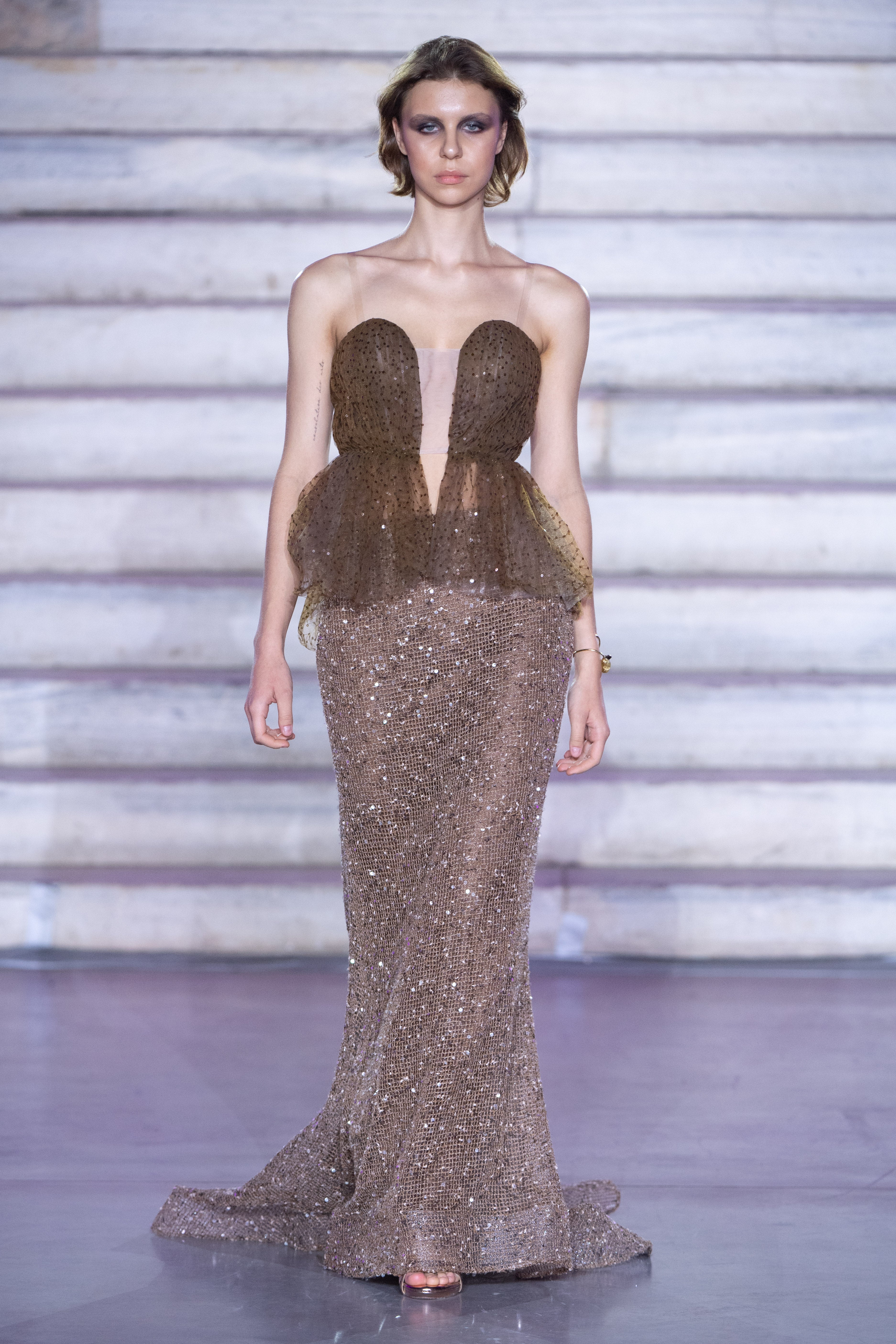 The softly contoured bodice is defined by delicate transparency and architectural shaping, creating a striking interplay between strength and vulnerability. A subtle peplum-inspired volume adds dimension at the waist, while the elongated skirt cascades fluidly to the floor, dusted with shimmering embellishment that catches the light with every step.