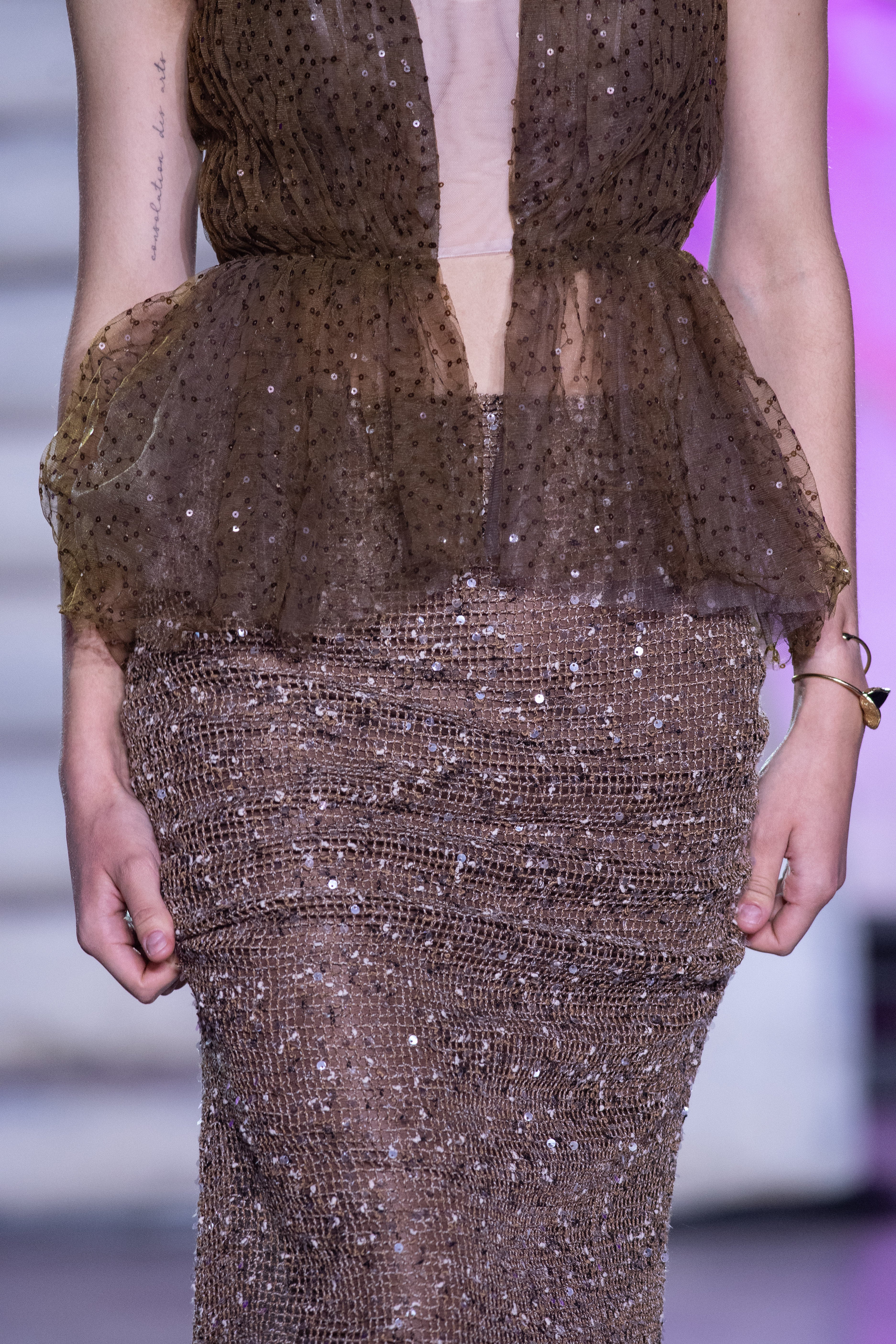 • Fluid, floor-length skirt with luminous embellishment
