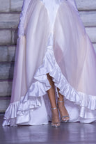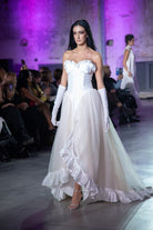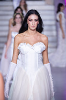 From the bodice, layers of weightless tulle cascade into a full, flowing skirt. An asymmetric ruffled panel sweeps diagonally across the gown, adding movement, dimension, and a touch of dramatic symbolism. Paired with satin opera gloves, the look strikes a perfect balance between classic romance and unconventional modernity.