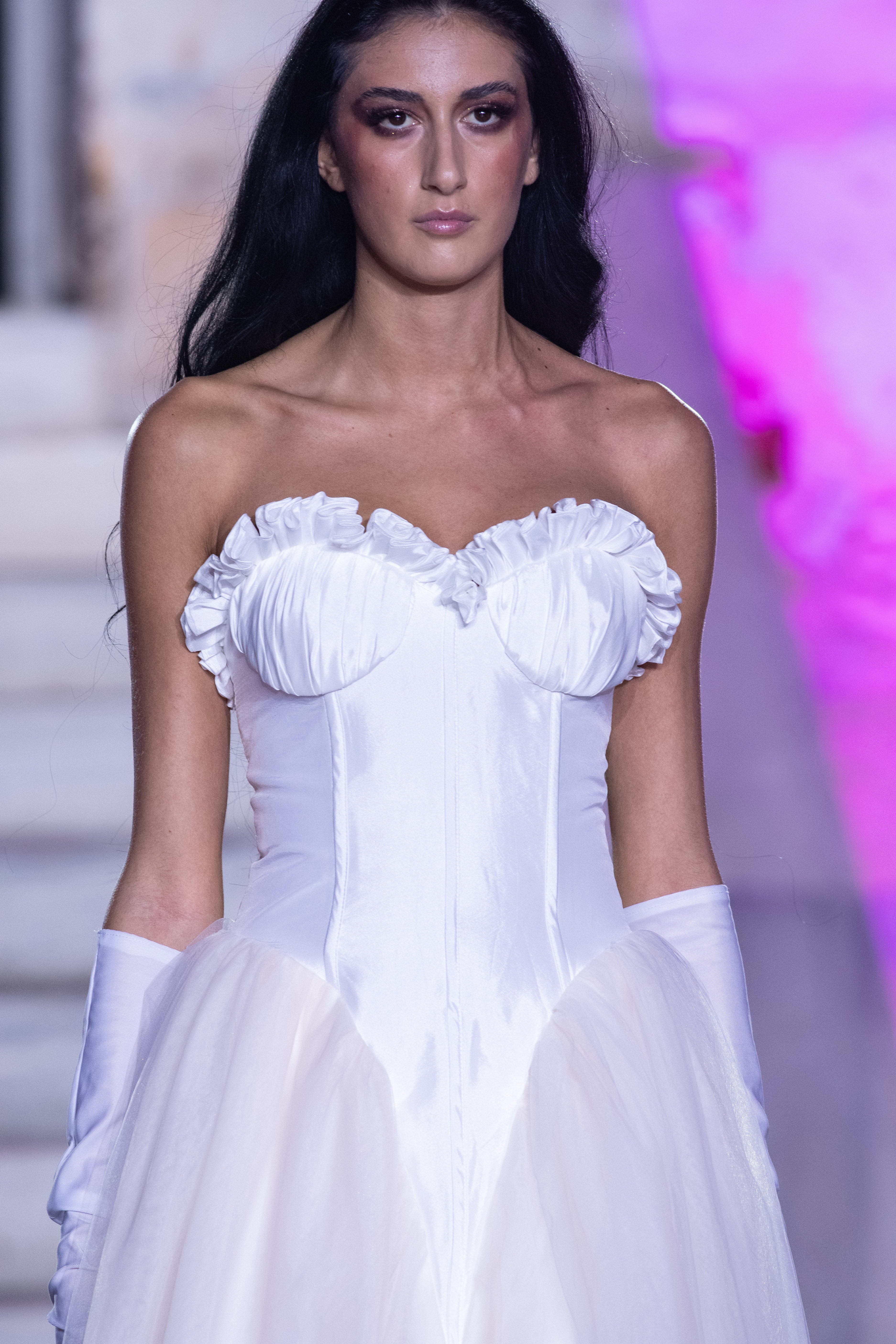 Part of a Awaken Your Myth collection, unveiled at Athens Fashion Week that celebrates feminine archetypes, this gown channels The Dreamer — a woman who shapes her own legend through authenticity and poetic strength. Petra Kara designs each piece as a personal narrative, translating emotion, symbolism, and the bride’s inner world into couture. Designed for the bride who refuses to choose between softness and strength, this piece embodies Petra Kara’s signature fusion of rebellion, ritual and poetic femininity.