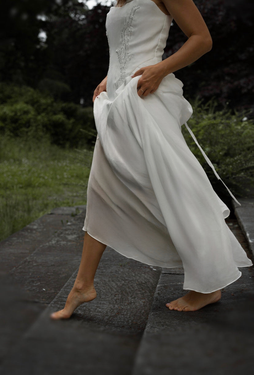 Made from premium, airy silk chiffon, the dress features a pleated texture that gracefully flows and moves with every step. The highlight is the beaded vintage corset, reinforced with boning for perfect support and closed with an elegant lace-up design. This combination of luxurious fabrics and intricate handwork ensures a dress that is both stunning and comfortable.