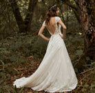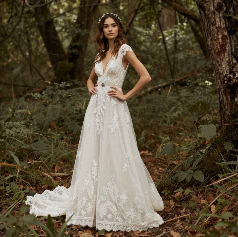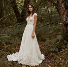 The Fairytale Boho Wedding Dress blends romance and freedom with a deep V neckline, delicate cap sleeves, and an open back that feels both timeless and undone. Floral cotton lace drifts over a soft, flowing skirt, finishing in a gentle train that moves like a dream.