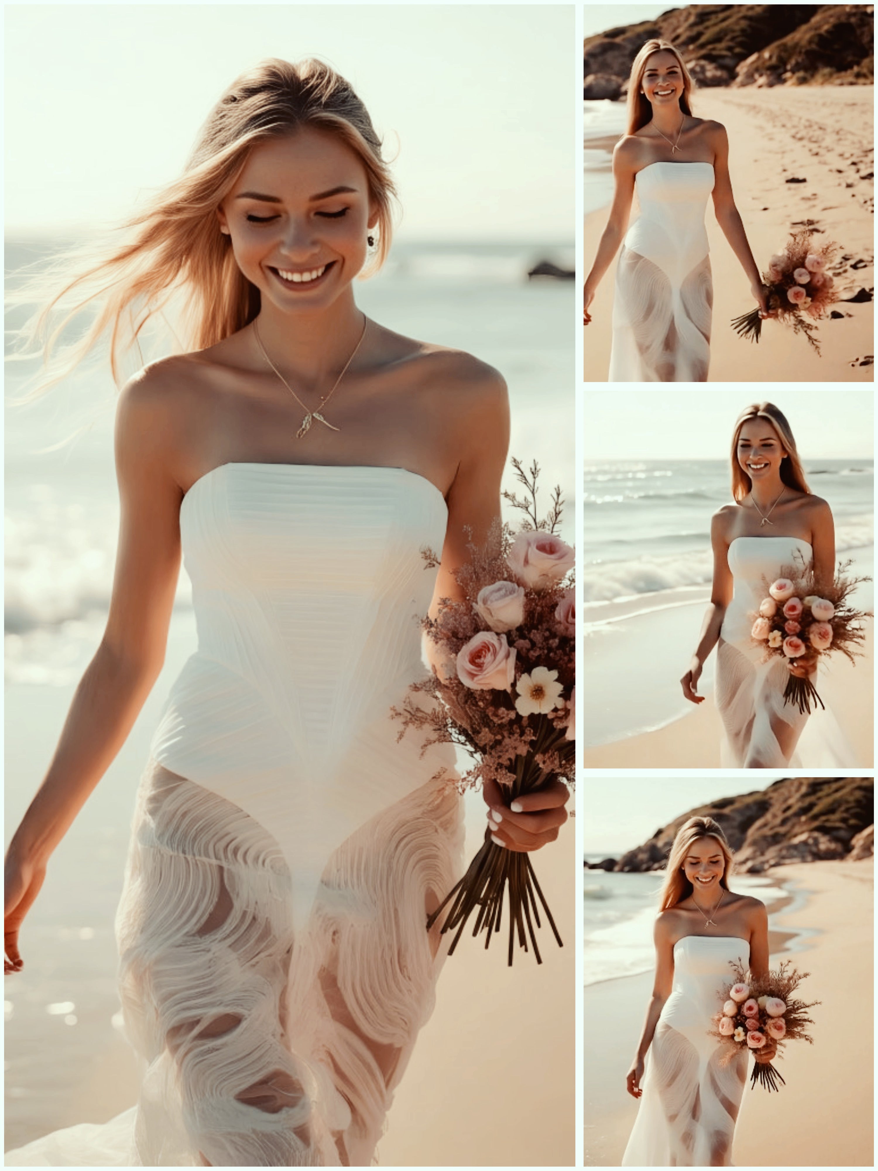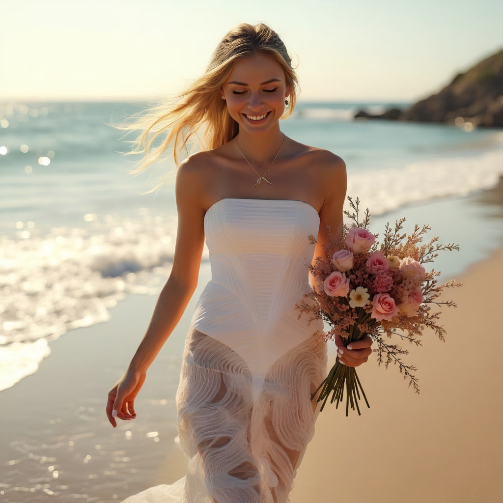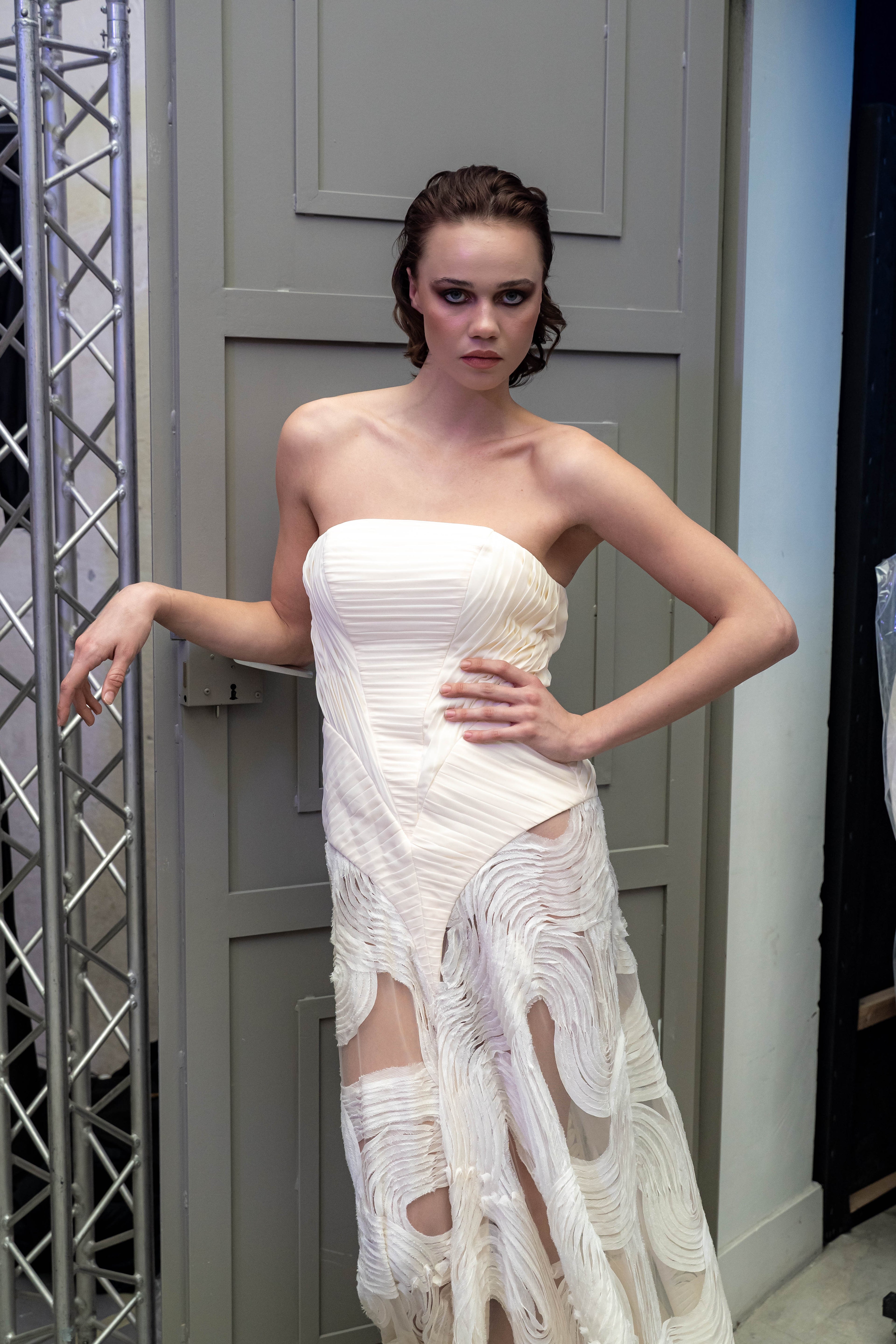 This gown emerges as a fluid work of art, where sculptural precision meets the ebb and flow of water-like texture. The structured, strapless bodice is crafted with luminous, finely folded fabric that contours the body in serene, architectural lines. It evokes the calm surface of still waters — poised, pure, and undeniably strong.