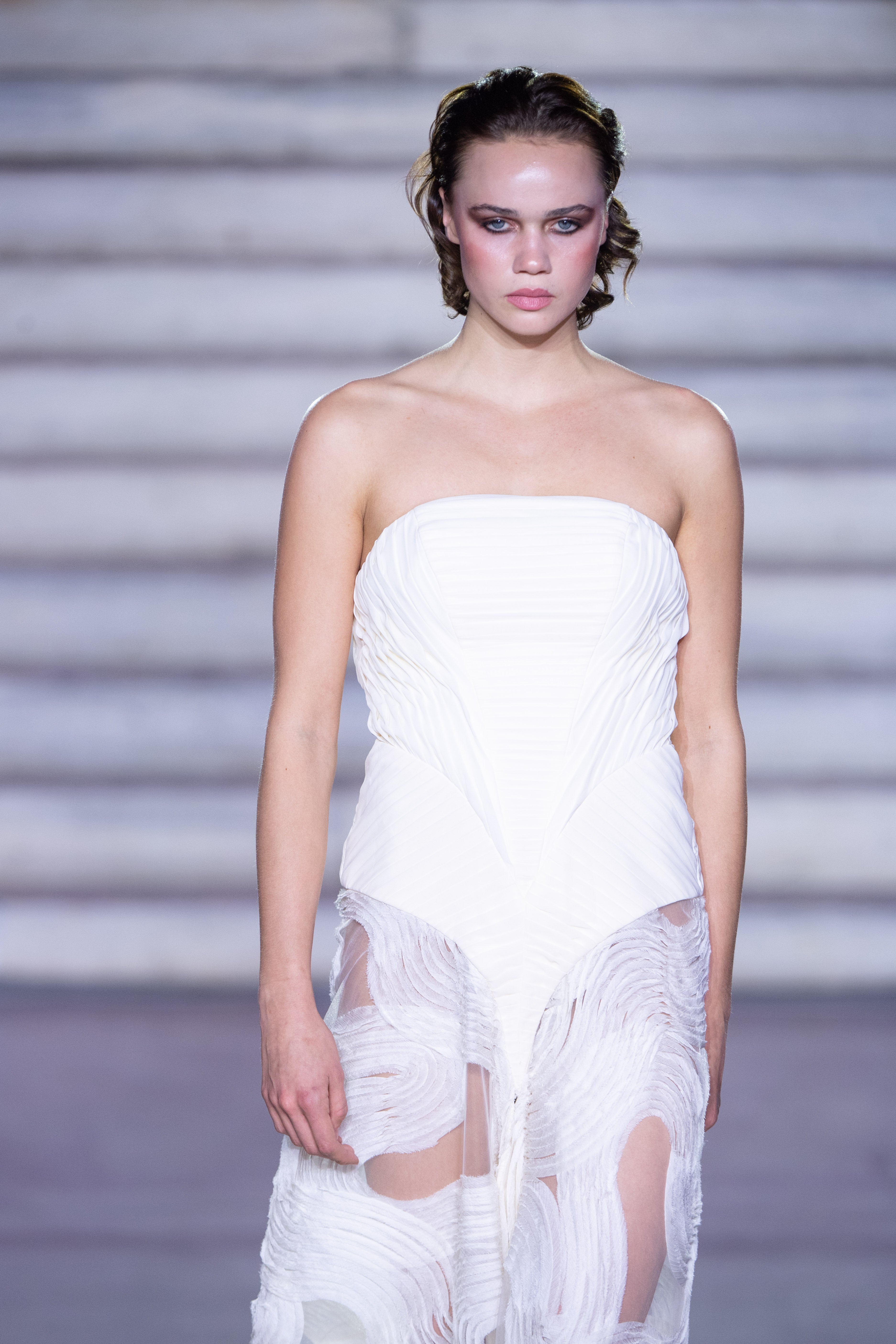 Skirt: Semi-sheer textural chiffon and organza panels, High airflow movement for fluidity on the runway