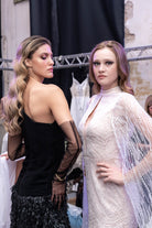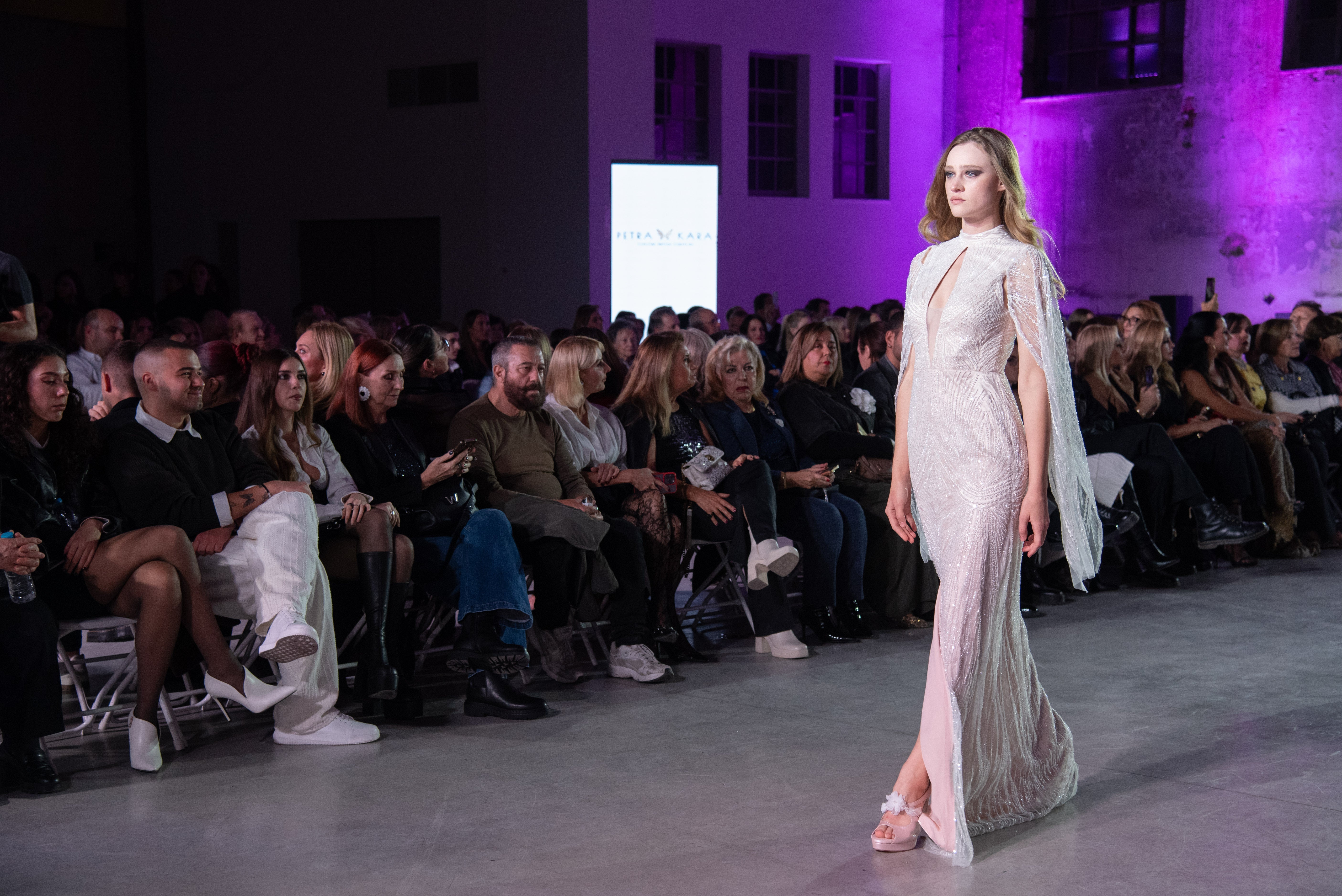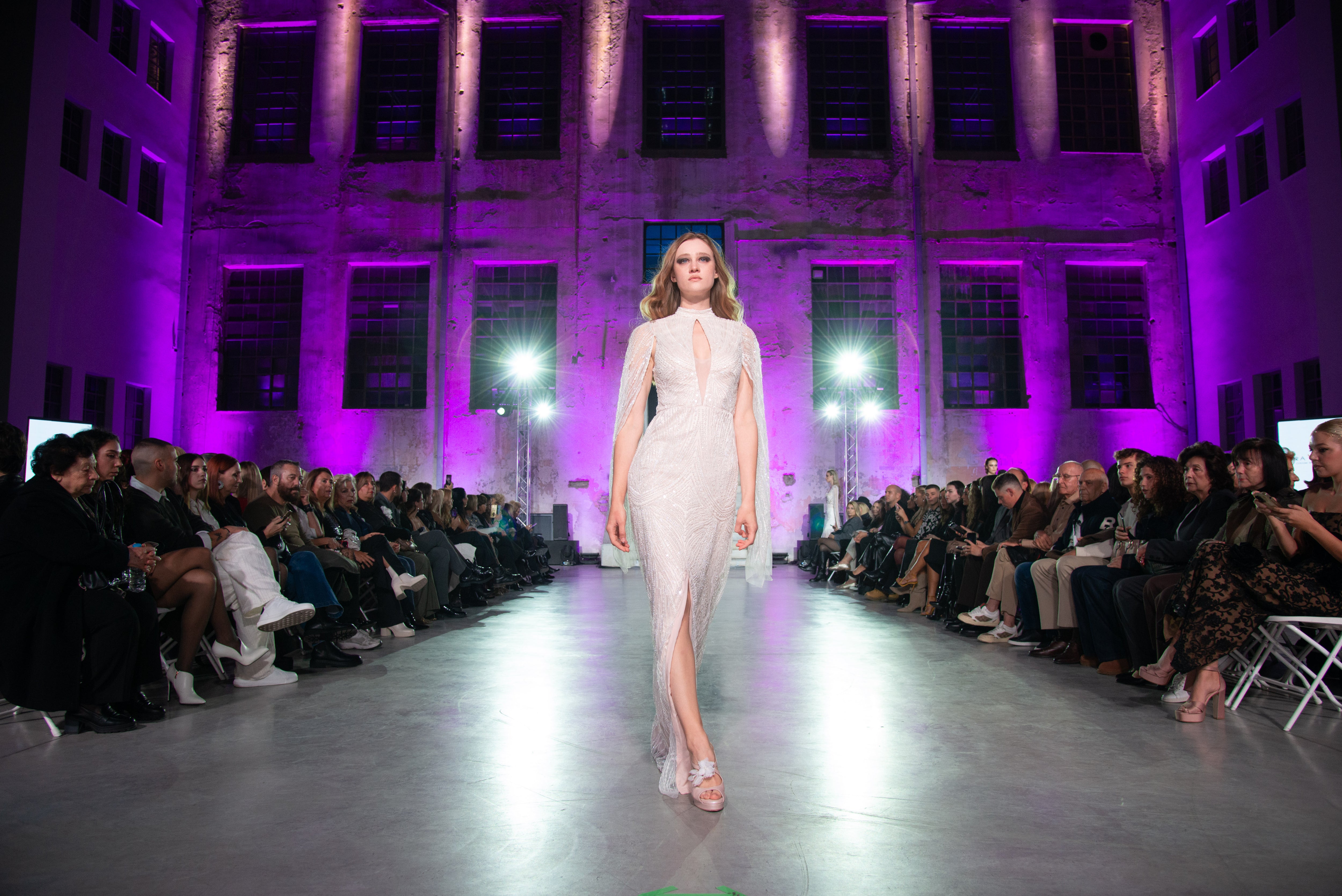 Celestial Aura represents the archetype of the luminous guide — a woman whose strength radiates from within presented at Athens Fashion Week. This gown is an homage to inner clarity, intuition, and serene confidence. It invites the bride to embrace her light not as ornament, but as essence: gentle, wise, and unmistakably her own.