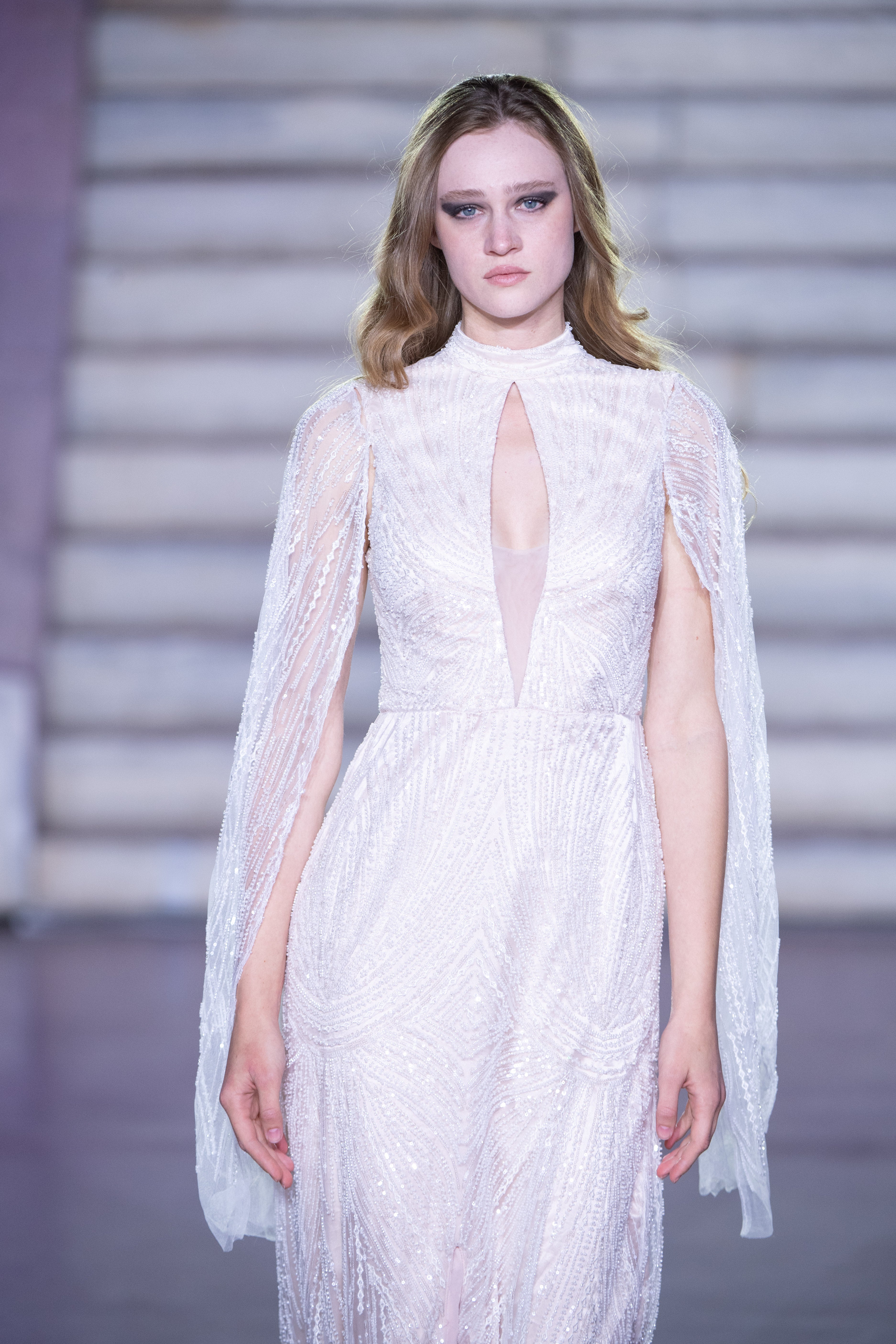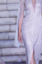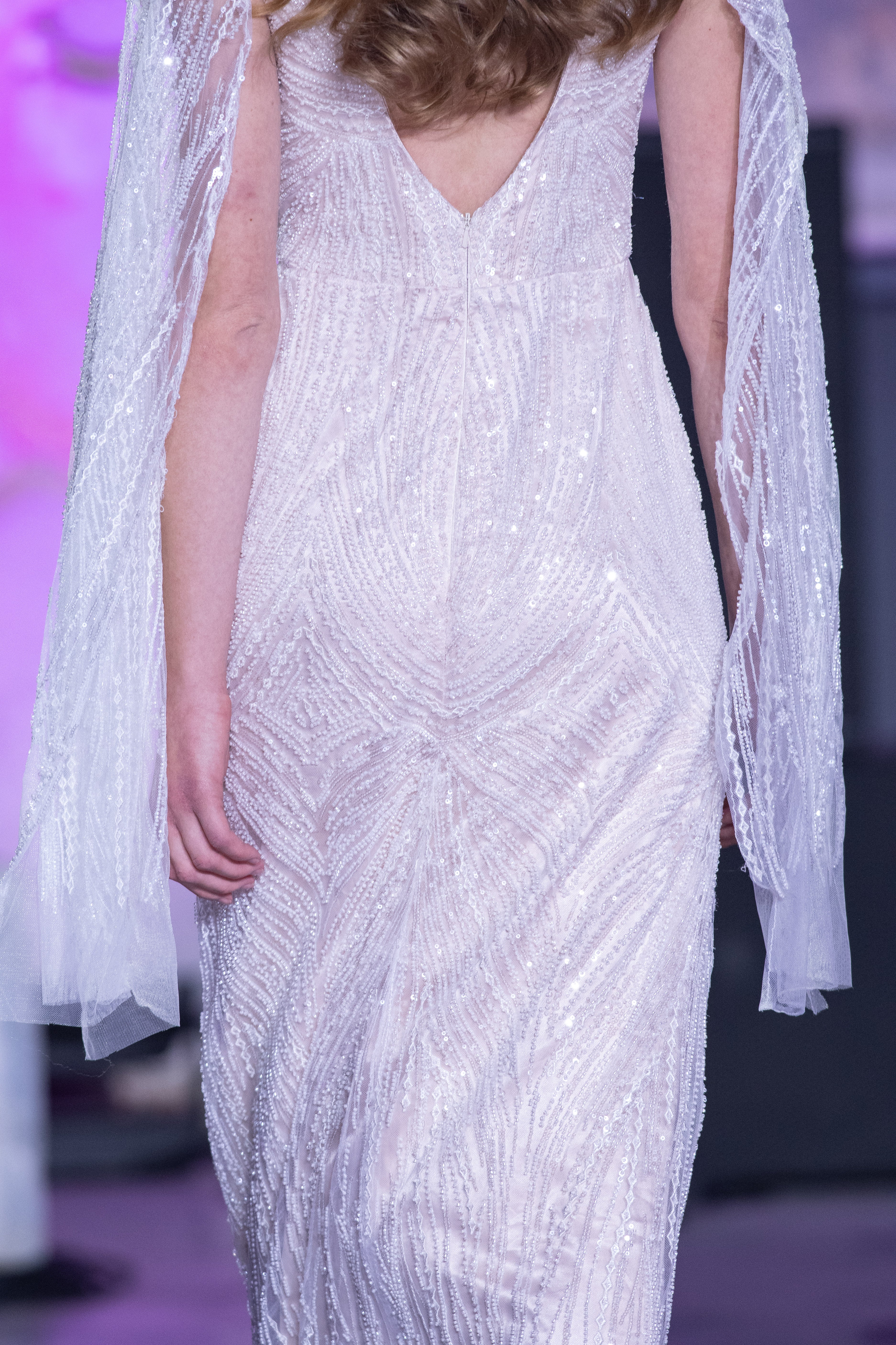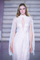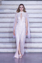The gown features a sleek, elongated silhouette adorned with shimmering beadwork that reflects light in delicate, celestial waves. A refined high neckline opens into a sculptural keyhole detail, balancing elegance with subtle sensuality. Draped, cape-like sleeves cascade from the shoulders, creating a soft halo of movement — a floating aura that surrounds the bride with an almost otherworldly presence.