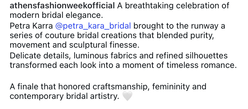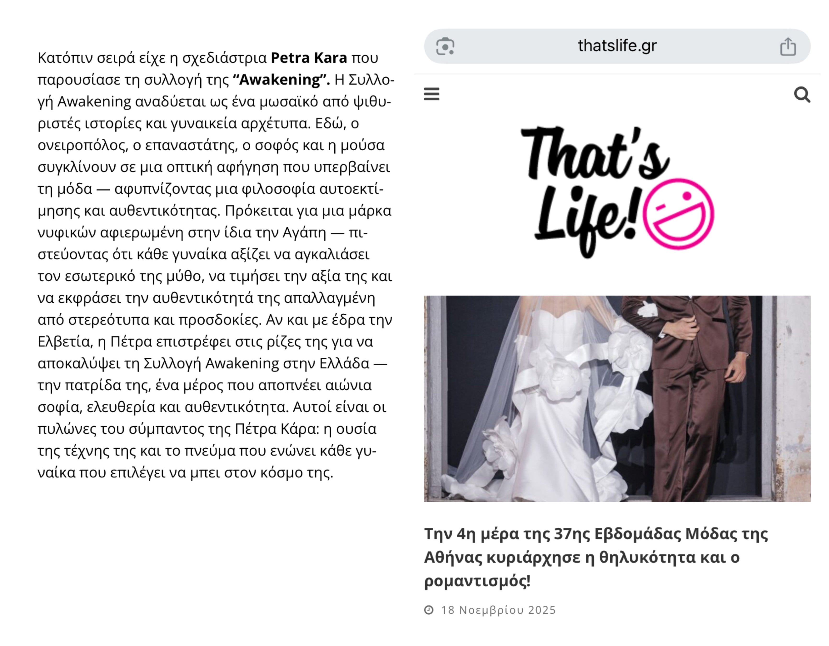 The Awaken Your Myth Collection was successfully presented in Athens Fashion Week in November 2025! The Collection emerges as a tapestry of whispered stories and feminine archetypes. Here, the dreamer, the rebel, the wise, and the muse converge in a visual narrative that transcends fashion — awakening a philosophy of self-worth and authenticity. This is a bridal brand devoted to Love itself — believing every woman deserves to embrace her inner myth, honor her worth, and express her authenticity free from stereotypes and expectations. The result is otherworldly: a fusion of rebellion and ritual, power and grace.