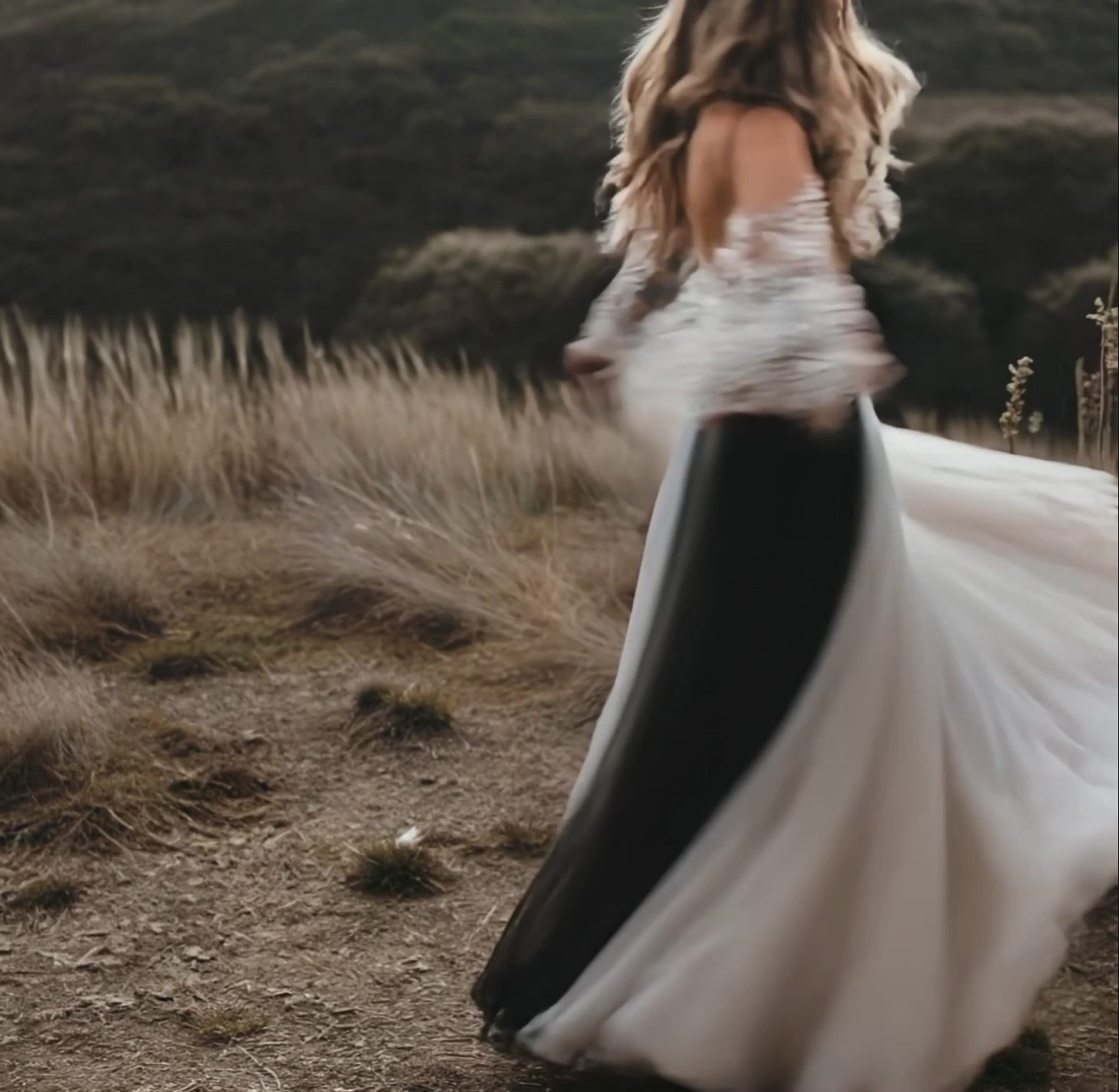 Crafted from premium black & white tulle and adorned with delicate black & white lace appliqués, this dress blends softness with striking contrast to embody a darkly romantic aesthetic. The materials are chosen not only for their beauty but also for their lightness and graceful movement, enhancing the ethereal quality of the gown.