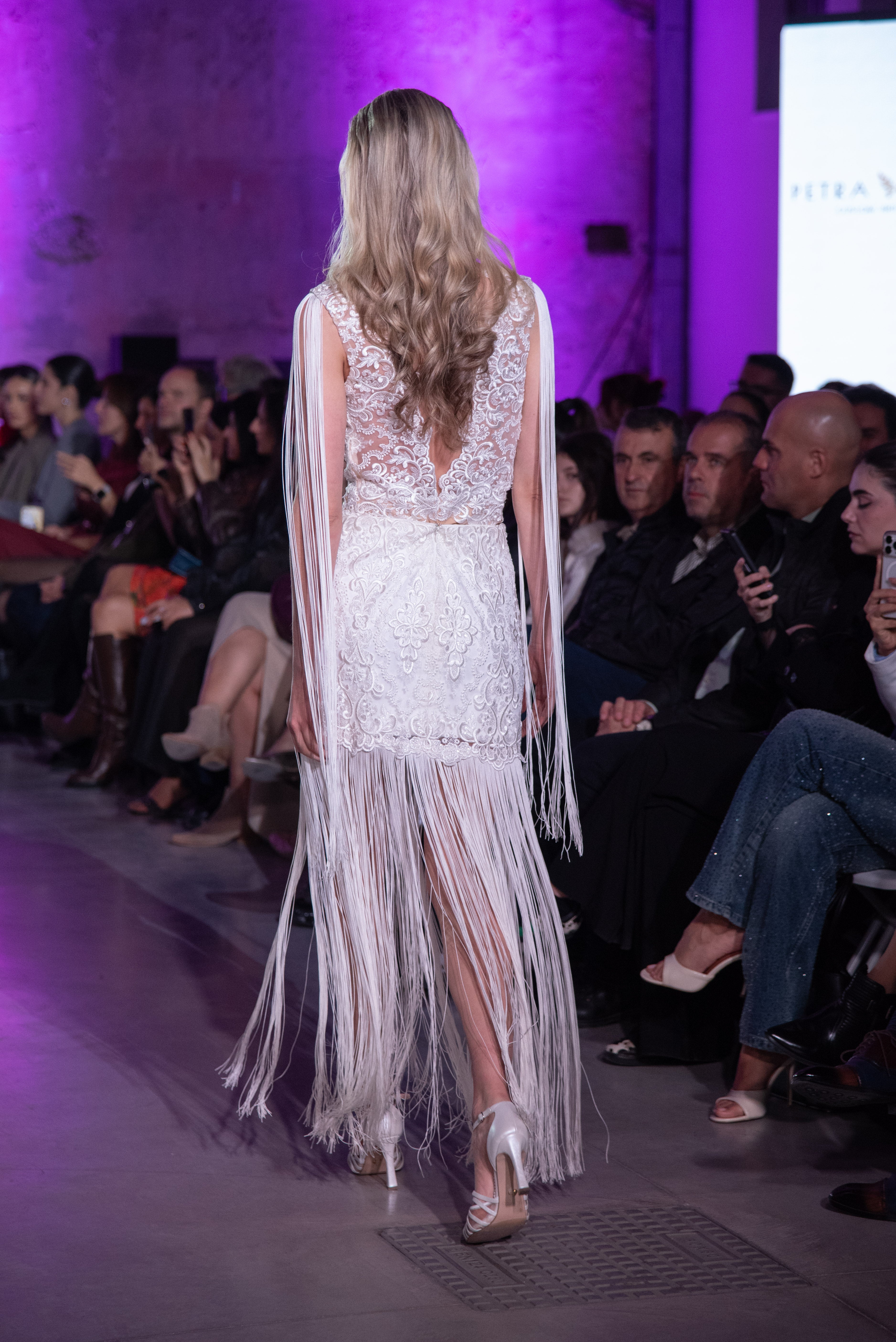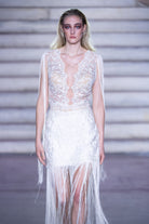 The PALACE Lace & Fringle dress is an exquisite handmade boho vintage wedding dress, crafted from high-quality French lace and silk tassels to create a stunning bridal look. This two-piece ensemble features a delicately designed bodysuit and a versatile skirt that elevates your wedding style with elegance and movement.