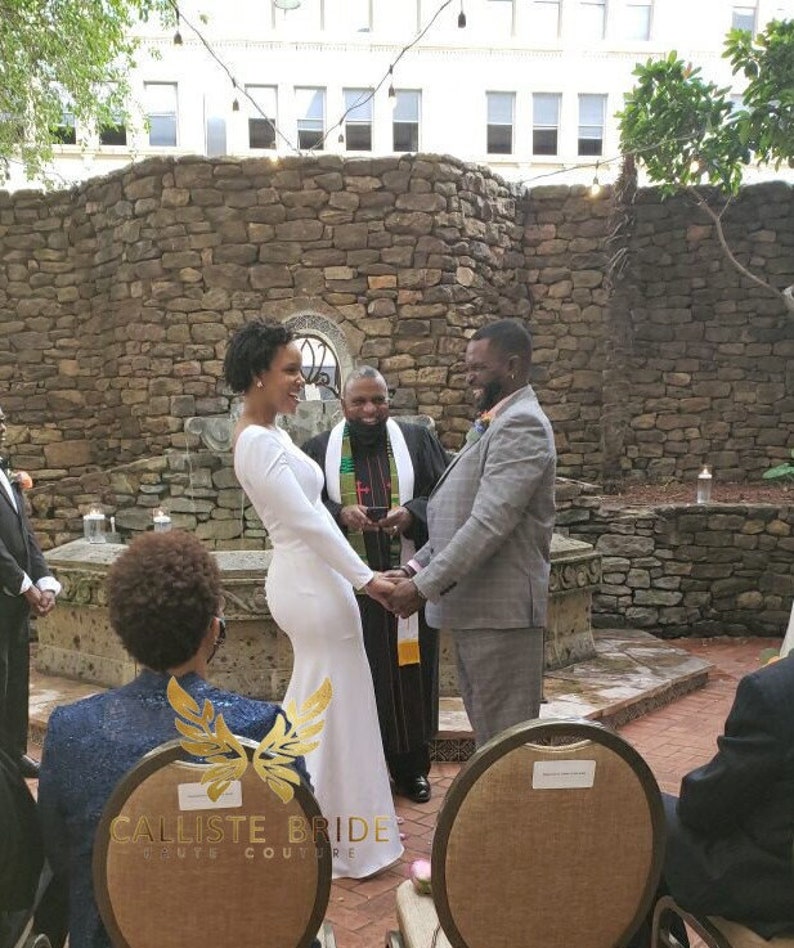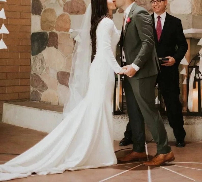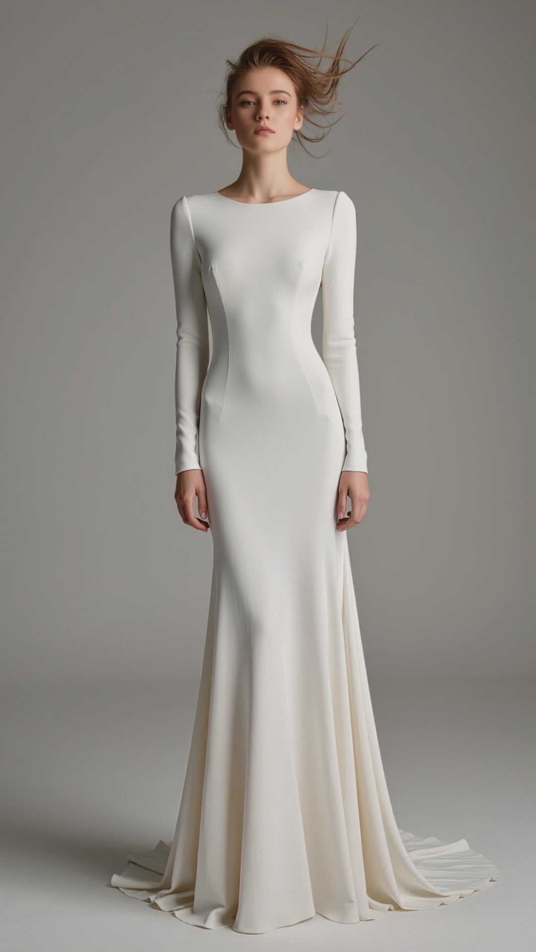 The SANTORINI dress is a stunning bridal gown crafted from crepe, designed to combine elegance with a minimal charm. Featuring a long-sleeve silhouette and a closed or an open back, this wedding dress beautifully balances a modest front with a seductive, ethereal style.